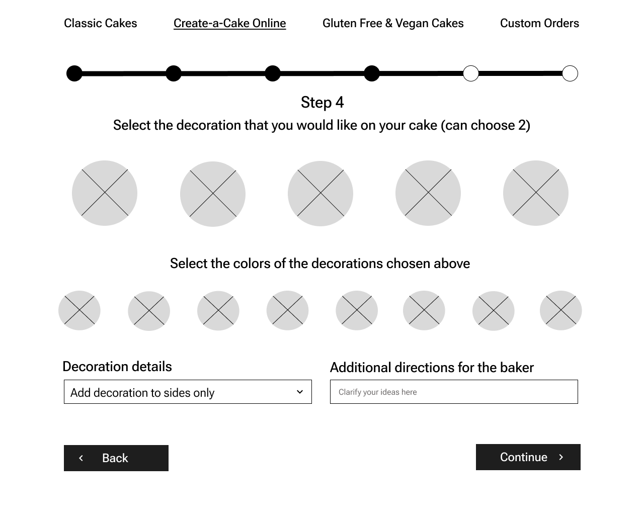 After completing my mid-fidelity wireframes, I scheduled usability tests. These tests were to evaluate the information architecture and to identify any problems in structure before starting the high-fidelity wireframes. No major issues were identified, but small improvements were made. User feedback revealed the need for clarity on the sign in option. It was unclear that this was also the sign up option, so making that obvious was very important. When selecting a pickup date, having the location of the bakery was an addition, especially if there were multiple bakeries. Lastly, adding labels to the create-a-cake progress bar so that users could move through the customization process with confidence. All of these changes were noted and applied to the high-fidelity wireframes.
