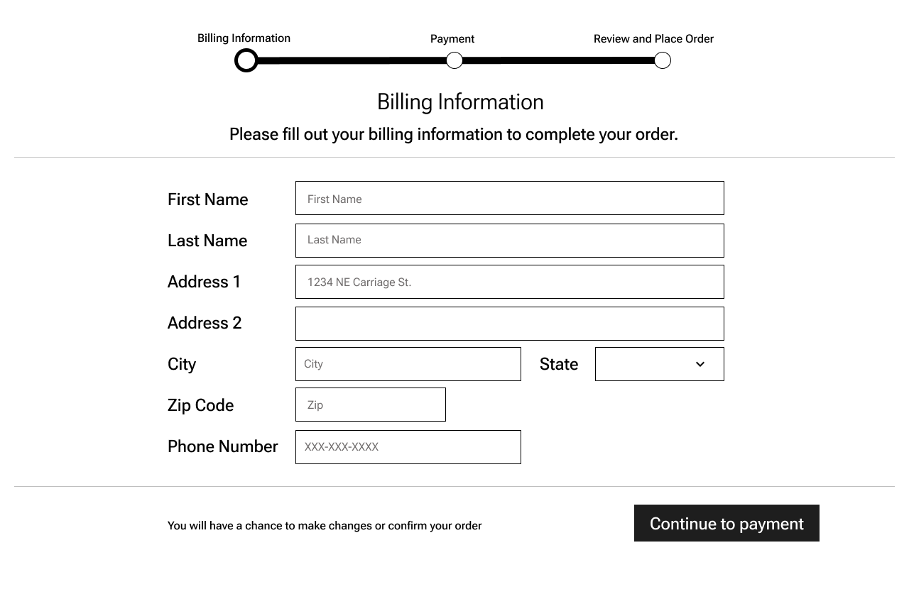 In further research of check out flows, I decided to refine the personal information collected to focus on what was truly necessary. The billing information was changed to contact information in order to eliminate the need for a full address. Since there is not a shipping option, name and phone number should be sufficient for the bakery. The zip code was added to credit card information as another form of security.